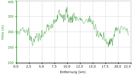 130m Höhenunterschied Gesamt- auf- und –abstieg ca. 1.335 m tiefster Punk 251m / höchster Punk 381m