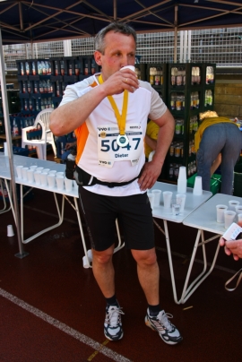 durchs Ziel. Sie haben großen Durst, soviel Wasser gibt es gar